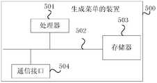 如图5所示,为根据本实施例的生成菜单的装置的结构示意图。该生成菜单的装置500包括至少一个处理器501、通信总线502、存储器503以及至少一个通信接口504。As shown in FIG. 5, it is a schematic structural diagram of an apparatus for generating a menu according to the present embodiment. Theapparatus 500 for generating a menu includes at least oneprocessor 501, acommunication bus 502, amemory 503, and at least onecommunication interface 504.
