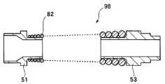 コイル受け部材51の基端側部分の外周部には、段差部51aが周方向に沿って形成されている。段差部51aにより形成される筒状外表面に外挿されるようにして、密着コイル52の先端部が、コイル受け部材51の基端部に接続され、接着剤、溶接、半田などにより固定されている。密着コイル52は、ステンレス等の金属製の筒状弾性部材である。Thestep part 51a is formed in the outer peripheral part of the base end side part of thecoil receiving member 51 along the circumferential direction. The distal end portion of thecontact coil 52 is connected to the proximal end portion of thecoil receiving member 51 so as to be extrapolated to the cylindrical outer surface formed by the steppedportion 51a, and is fixed by an adhesive, welding, soldering, or the like. Yes. Theclose contact coil 52 is a cylindrical elastic member made of metal such as stainless steel.
