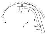 しかし、挿入部4が、検査対象内の大きく曲がった内壁Wに沿ってさらに進むと、図6に示すように、湾曲部8に続いて、筒状弾性部9も曲がるため、押し込む力が湾曲部8だけでなく、筒状弾性部9にも掛かる。よって、図4の湾曲部103の曲率半径に比べて、湾曲部8と筒状弾性部9は、共に大きな曲率半径で曲がる。As shown in FIG. 5, the curvature radius of the bendingportion 8 when the distal endrigid portion 7 of theinsertion portion 4 starts to advance along the inner wall W is large, and the bendingportion 8 is not greatly bent.