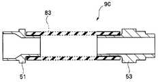 図9は、第1及び第2の実施の形態の変形例に関わる、ゴム部材を有する筒状弾性部の構成を説明するための、軸方向に沿った筒状弾性部9Cの模式的断面図である。円筒状のゴム部材83が、コイル受け部材51の基端部とコイル受け部材53の先端部の間に配置される。In the two embodiments described above, the cylindricalelastic portions 9 and 9A are configured to include the close contact coil, but a tubular rubber member may be used instead of the close contact coil.