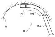 しかし、挿入部101が、検査対象内の大きく曲がった内壁Wに沿ってさらに進むと、図4に示すように、湾曲部103が、折れ曲がるように大きく曲がってしまう。As shown in FIG. 3, the curvature radius of thecurved portion 103 when the distal endrigid portion 102 of theinsertion portion 101 starts to advance along the inner wall W is large, and thecurved portion 103 is not greatly bent.