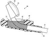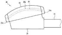 超音波内視鏡1の組み立て時においては、図6及び図7に示すように、超音波振動子部20がケーブル21の先端に接続され、音響レンズ23が超音波振動子部20に固着されてなる超音波ユニット40が作製される。そして、この超音波ユニット40が、後述するハウジング30内に収められ、固定される。When theultrasonic endoscope 1 is assembled, as shown in FIGS. 6 and 7, theultrasonic transducer unit 20 is connected to the tip of thecable 21, and theacoustic lens 23 is fixed to theultrasonic transducer unit 20. Anultrasonic unit 40 is produced. And thisultrasonic unit 40 is stored in thehousing 30 mentioned later, and is fixed.