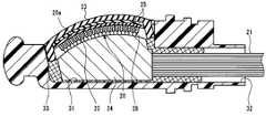 第2開口部32は、第1開口部31とハウジング30の外部とを連通する貫通孔であり、複数の同軸線の束であるケーブル21が所定の隙間を有して挿通される。Thesecond opening 32 is a through-hole that communicates thefirst opening 31 and the outside of thehousing 30, and thecable 21 that is a bundle of a plurality of coaxial wires is inserted with a predetermined gap.