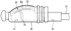 まず、図9に示すように、ケーブル21を、ハウジング30の第1開口部31側から第2開口部32内に挿通する。次に、図10に示すように、ハウジング30の第1開口部31内を、脱泡済みの硬化前の接着剤33で満たす。図10及び図11では、脱泡済みの硬化前の状態にある接着剤33を、網掛けのハッチングで示している。接着剤33は、重力によって第2開口部32とケーブル21との間の隙間から流れ出し難い粘度を有するものが使われる。First, as shown in FIG. 9, thecable 21 is inserted into thesecond opening 32 from thefirst opening 31 side of thehousing 30. Next, as shown in FIG. 10, the inside of thefirst opening 31 of thehousing 30 is filled with the defoamed adhesive 33 before curing. In FIG.10 and FIG.11, theadhesive agent 33 in the state before hardening after defoaming is shown by the hatching of the hatching. The adhesive 33 has a viscosity that is difficult to flow out of the gap between thesecond opening 32 and thecable 21 due to gravity.