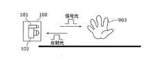 反射光2102のタイミングチャートに示すとおり、時刻T4は、第1の反射開始時刻、時刻T5は、第1の反射終了時刻であり、時刻T4~時刻T5は、第1の反射時間である。時刻T10は、第2の反射開始時刻、時刻T12は、第2の反射終了時刻であり、時刻T10~時刻T12は、第2の反射時間である。発光時間と反射時間とは等しい長さTであることを想定しているが、この限りではない。As shown in the timing chart of the reflected light 2102, time T4 is the first reflection start time, time T5 is the first reflection end time, and time T4 to time T5 are the first reflection time. Time T10 is the second reflection start time, time T12 is the second reflection end time, and time T10 to time T12 are the second reflection time. Although it is assumed that the light emission time and the reflection time have the same length T, this is not restrictive.