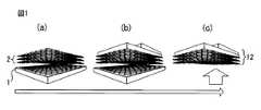 図1は、グラフェン層を基板からb) グラフェン層間で間接的に引き剥がす、多層グラフェン膜を用いた薄膜太陽電池の引き剥がしの概念図である。図1において、(a)は基板1上にグラフェン膜を積層して複数のグラフェン層2を形成し、(b)はさらに半導体膜を含む半導体素子を形成(薄膜太陽電池の作製)した後に、グラフェン層間で引き剥がし、その結果、(c)は半導体素子12としてグラフェン層を電極とする自立型薄膜太陽電池が作製される、ことを示す。FIG. 1 is a conceptual diagram of peeling of a thin film solar cell using a multilayer graphene film, in which a graphene layer is indirectly peeled off from a substrate b) and a graphene layer. In FIG. 1, (a) stacks a graphene film on a