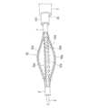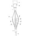 図20および図21に示されるように、外側部材610のストラット610aは互いに周方向に90度ずつずらして配置される。各ストラット610aは、一本の金属パイプに4本の切れ目を作製し、拡張状態で形状記憶することで製造される。各ストラット610aは、回転されたときに体内の接触箇所を傷付けないように、非外傷性の加工を施されていることが好ましい。このようにすることで、外側部材610の回転では狭窄部400を傷付けず、突出した病変のみを除去することが可能となる。非外傷性の加工とは、例えば側面を曲面にするような加工が挙げられる。また、内側部材611の各ストラット611aは、一本の金属パイプに螺旋状の切れ目を6か所作製し、拡張状態で形状記憶することによって製造される。このように構成することで、内側部材611が拡張状態になった際に、各ストラット611aの角度(薄板の側面の向く向き)に変化が生じ、ストラット611aの側面を使用した閉塞物の除去が可能となる。従って、内側部材611の各ストラット611aは、それぞれが螺旋形状の薄板を構成し、縮経状態にされた場合には、一本の金属パイプとなる。20 and 21, thestruts 610a of theouter member 610 are arranged so as to be shifted from each other by 90 degrees in the circumferential direction. Eachstrut 610a is manufactured by making four cuts in one metal pipe and storing the shape in an expanded state. Eachstrut 610a is preferably atraumatically processed so as not to damage the contact portion in the body when rotated. By doing so, it is possible to remove only the protruding lesion without damaging theconstriction 400 by rotating theouter member 610. Non-traumatic processing includes processing such that the side surface is curved. Eachstrut 611a of theinner member 611 is manufactured by making six spiral cuts in one metal pipe and storing the shape in an expanded state. With this configuration, when theinner member 611 is in the expanded state, the angle of eachstrut 611a (the direction of the side surface of the thin plate) changes, and the obstructions using the side surfaces of thestrut 611a can be removed. It becomes possible. Accordingly, each of thestruts 611a of theinner member 611 constitutes a spiral thin plate, and becomes a single metal pipe when it is in a contracted state.