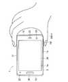 また制御部100は、上述の図28の例において、指の押圧の強さ及び指の種類を判定せず、指の向きが0度のとき表示パネル120にホーム画面を表示させ、指の向きが+90度のときと-90度のときにカメラアプリケーションを実行してもよい。指の向きが+90度のときと-90度のときには、図31,32に示されるように、電子機器1が横向きで使用されている可能性が高い。電子機器1が横向きで使用される場合には、ユーザが電子機器1のカメラ機能を使用したいと考えている可能性がある。したがって、指の向きが+90度のときと-90度のときにカメラアプリケーションが実行されることによって、横向きで電子機器1を使用するユーザはすぐに電子機器1のカメラ機能を使用することができる。よって、電子機器1の操作性が向上する。In addition, in the example of FIG. 28 described above, thecontrol unit 100 does not determine the strength of finger press and the type of finger, and displays the home screen on thedisplay panel 120 when the finger orientation is 0 degrees, The camera application may be executed when is 90 degrees and -90 degrees. When the orientation of the finger is +90 degrees and −90 degrees, as shown in FIGS. 31 and 32, there is a high possibility that theelectronic device 1 is being used sideways. When theelectronic device 1 is used sideways, the user may want to use the camera function of theelectronic device 1. Therefore, when the camera application is executed when the finger orientation is +90 degrees and −90 degrees, the user who uses theelectronic device 1 in the landscape orientation can immediately use the camera function of theelectronic device 1. . Therefore, the operability of theelectronic device 1 is improved.