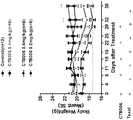 FIG. 33 is a graph showing the effects of CTB006 and interferon α-2b administered alone and in combination on tumor volume in a murine primary renal cancer xenograft model.