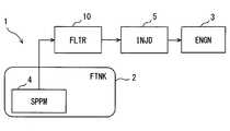 燃料供給装置1は、燃料タンク2内の液体燃料を噴射装置(INJD)5に供給するための供給ポンプ(SPPM)4を有する。図示の例では、供給ポンプ4は、燃料タンク2内に配置されている。噴射装置5は、供給ポンプ4によって供給される比較的低圧の燃料を、噴射に適した高圧に加圧する高圧ポンプを含む。さらに、噴射装置5は、高圧の燃料を、内燃機関3の燃焼室内に噴射する噴射弁を含む。 The