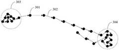 用户的运动轨迹可以包括运动路线和停留点。运动路线即多个位置的连线。停留点是根据运动路线中轨迹点的集中情况来确定的。例如,将多个时间相邻的速度均在速度阈值以下的轨迹点合并为一个停留位置,如果这些停留位置中任两个停留位置的中心之间的距离小于距离阈值,并且,多个停留位置中第一个停留位置的停留时间的开始时刻到最后一个停留位置的结束时刻之间的时间间隔大于时间阈值时,则将这多个停留位置组成的区域判定为停留点。其中,停留点的位置可以用这多个停留位置组成的区域的中心位置来表示。如图3所示,圆形区域303、304内的各轨迹点组成的区域为一个停留点。可选地,轨迹点的速度可以通过两个轨迹点之间的距离除以经过两个轨迹点所用的时间来计算。The user's motion trajectory can include a motion route and a stay point. A moving route is a connection of multiple locations. The stop point is determined based on the concentration of the track points in the motion route. For example, a plurality of temporally adjacent track points whose speeds are below a speed threshold are merged into one stop position, if the distance between the centers of any two of the stop positions is less than a distance threshold, and a plurality of stop positions When the time interval between the start time of the dwell time of the first stop position and the end time of the last stop position is greater than the time threshold, the area composed of the plurality of stop positions is determined as the stay point. Wherein, the position of the stay point can be represented by the center position of the area composed of the plurality of stay positions. As shown in FIG. 3, the area composed of the respective track points in the
