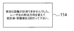 従って、本発明の第3の態様に係る測距装置は、対応関係を新たに求めることを促す情報を提示しない場合に比べ、対応関係を新たに求めることで本画像内照射位置の精度の低下が抑制されることを、ユーザに容易に認識させることができる。Therefore, the distance measuring apparatus according to the third aspect of the present invention reduces the accuracy of the irradiation position in the main image by newly obtaining the correspondence, compared to the case where the information prompting to newly obtain the correspondence is not presented. Can be easily recognized by the user.