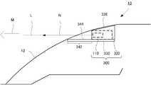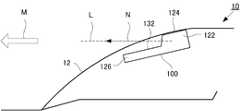 撮像装置110は、図1に示すように、撮像レンズ112を筐体120の開口部130に向けて筐体120の上段部分122に収納される。また、撮像装置110は、車両10の進行方向Mと、撮像装置110の撮像方向Nと撮像レンズ112の光軸Lとを一致させるために、撮像レンズ112の光軸Lを上段部分122の上面124の方向に傾けた状態で筐体120に収納される。As shown in FIG. 1, the