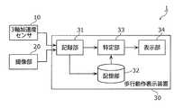 図1に示すように、歩行動作表示システム1は、3軸加速度センサ10と、撮像部20と、歩行動作表示装置30とを備える。図2に示すように、歩行動作表示装置30は、記録部31と、記憶部32と、特定部33と、表示部34とを備える。As shown in FIG. 1, the walkingmotion display system 1 includes atriaxial acceleration sensor 10, animaging unit 20, and a walkingmotion display device 30. As shown in FIG. 2, the walkingmotion display device 30 includes arecording unit 31, astorage unit 32, aspecifying unit 33, and adisplay unit 34.