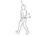 本実施の形態では、3軸加速度センサ10は、図3に示すように、被験者2の背面側の腰部に取り付けられる。図1に示すように、3軸加速度センサ10は、装着具11に固定されている。装着具11は、被験者2に装着されることで、3軸加速度センサ10を被験者2の所定の部位に取り付けることができる。In the present embodiment, the three-axis acceleration sensor 10 is attached to the waist on the back side of thesubject 2 as shown in FIG. As shown in FIG. 1, thetriaxial acceleration sensor 10 is fixed to the wearingtool 11. The wearingtool 11 can be attached to thesubject 2 to attach thetriaxial acceleration sensor 10 to a predetermined part of thesubject 2.
