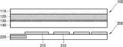 먼저 도 1을 참조하면, 디스플레이 층(100)과 기판(200)이 마련된다. 디스플레이 층(100)은 접착층(110), 표시부(120), 공통 전극(130), 및 투명판(140)을 포함할 수 있다. 기판(200) 상에는 적어도 하나의 개별 전극(210) 및 연결 전극(220)이 형성될 수 있다. 개별 전극(210)은 기판(200) 상에 형성될 수 있고, 연결 전극(220)은 기판(200) 내로 삽입(embedded)되어 형성될 수 있다. 선택적인 실시예에서, 연결 전극(220)은 기판(200) 상에서 상기 개별 전극(210)과 인접하여 형성될 수도 있다.First, referring to FIG. 1, a display layer 100 and a substrate 200 are provided. The display layer 100 may include an adhesive layer 110, a display unit 120, a common electrode 130, and a transparent plate 140. At least one individual electrode 210 and a connection electrode 220 may be formed on the substrate 200. The individual electrode 210 may be formed on the substrate 200, and the connection electrode 220 may be formed by being embedded into the substrate 200. In an alternative embodiment, the connection electrode 220 may be formed adjacent to the individual electrode 210 on the substrate 200.