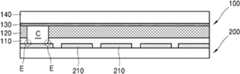 전술한 실시예들에서 설명된 바와 같이, 기판(200)의 연결 영역(C)은 레이저 컷팅 등의 제1 공정에 의해 형성되고, 공통 전극(130)은 기판(200)과 디스플레이가 접착된 이후 별도의 레이저 컷팅 또는 석션과 같은 제2 공정에 의해 노출된다. 상기 제1 공정과 제2 공정은 서로 다른 시점에 수행되기 때문에, 연결 영역(C)의 단면과 디스플레이 층(100)이 제거된 영역의 단면은 상이할 수 있다. 그 결과 연결 영역(C) 및 디스플레이 층(100)이 제거된 영역을 충전하는 도전성 물질은 부분적으로 서로 다른 측벽 프로파일을 가질 수 있다.As described in the above embodiments, the connection region C of the substrate 200 is formed by a first process such as laser cutting, and the common electrode 130 is bonded to the substrate 200 after the display is bonded. Exposed by a second process such as separate laser cutting or suction. Since the first process and the second process are performed at different times, the cross section of the connection region C and the cross section of the region where the display layer 100 is removed may be different. As a result, the conductive material filling the region from which the connection region C and the display layer 100 are removed may have partially different sidewall profiles.