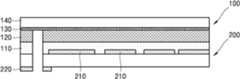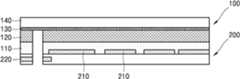 여기서 사용되는 기판(200)은 도 21에 나타난 기판일 수 있다, 즉, 연결 전극(220)이 기판 내로 삽입되고 연결 전극(220)을 노출시키는 홀이 형성된 기판이 디스플레이 층(100)과 접촉될 수 있다. 또한 도면에 도시되지는 않았지만, 기판(200)은 도 23에 나타난 기판일 수도 있다.The substrate 200 used herein may be the substrate shown in FIG. 21, that is, a substrate in which a connection electrode 220 is inserted into the substrate and a hole in which the connection electrode 220 is exposed is in contact with the display layer 100. Can be. Although not shown in the drawings, the substrate 200 may be a substrate shown in FIG. 23.