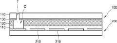 선택적인 실시예에서, 기판(200)의 재질이 플라스틱 또는 필름 형태의 기판(200)인 경우, 연결 영역(C)을 형성하지 않고 디스플레이 층(100)과 기판(200)을 접착할 수도 있다. 이후 매립된 연결 전극(220)이 형성된 영역에 홀을 형성하여 공통 전극(130)을 노출시키고, 상기 홀을 통해 연결 전극(220)과 공통 전극(130)을 전기적으로 연결하는 액상의 도전성 물질이 채워질 수도 있다.In an alternative embodiment, when the substrate 200 is formed of a plastic or film type substrate 200, the display layer 100 and the substrate 200 may be adhered to each other without forming the connection region C. Thereafter, a hole is formed in a region where the buried connection electrode 220 is formed to expose the common electrode 130, and a liquid conductive material electrically connecting the connection electrode 220 and the common electrode 130 through the hole is formed. It may be filled.