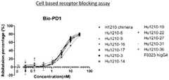 As shown in Table 12 below, Hu1210-3, Hu1210-9, Hu1210-8, Hu1210-14, Hu1210-17, Hu1210-19 and Hu1210-22 antibodies show comparable efficacy with chimeric antibody to blocking the binding of PD-L1 to PD-1.