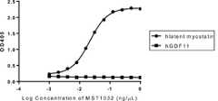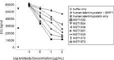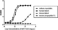 The terms "anti-myostatin antibody" and "an antibody that binds to myostatin" refer to an antibody that is capable of binding myostatin with sufficient affinity such that the antibody is useful as a diagnostic and/or therapeutic agent in targeting myostatin.  In one embodiment, the extent of binding of an anti-myostatin antibody to an unrelated, non-myostatin protein is less than about 10% of the binding of the antibody to myostatin as measured, e.g., by a radioimmunoassay (RIA).  In certain embodiments, an antibody that binds to myostatin has a dissociation constant (Kd) of 1 micro M or less, 100 nM or less, 10 nM or less, 1 nM or less, 0.1 nM or less, 0.01 nM or less, or 0.001 nM or less (e.g., 10-8M or less, e.g., from 10-8M to 10-13M, e.g., from 10-9M to 10-13 M).  In certain embodiments, an anti myostatin antibody binds to an epitope of myostatin that is conserved among myostatin from different species.
