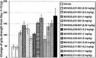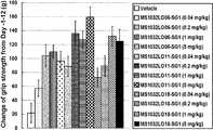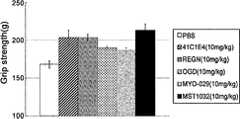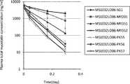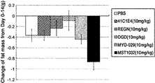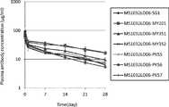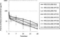 The elimination of myostatin and anti-latent myostatin antibody were assessed in vivo upon co-administration of anti-latent myostatin antibody and human latent myostatin in all human Fc gamma R transgenic mice (Figures 24 and 25).  An anti-latent myostatin antibody (0.3 mg/ml) and latent myostatin (0.05 mg/ml) were administered at a single dose of 10 ml/kg into the caudal vein. Anti-CD4 antibody (1 mg/ml) was administered three times (every 10days) at a dose of 10 ml/kg into the caudal vein to suppress anti-drug antibody. Blood was collected at 5 minutes, 15 minutes, 1 hour, 4 hours, 7 hours, 1 day, 2 days, 7 days, 14 days, 21 days, and 28 days after administration. The collected blood was centrifuged immediately at 15,000 rpm in 4 degrees C for 5 minutes to separate the plasma.  The separated plasma was stored at or below -20 degrees C until measurement. The anti-latent myostatin antibodies used were MS1032LO06-SG1, MS1032LO06-MY101, MS1032LO06-PK2, MS1032LO06-MY201, MS1032LO06-MY351, MS1032LO06-MY205, MS1032LO06-MY344 and MS1032LO06-MY335.