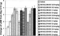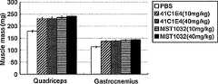 The elimination of myostatin and anti-latent myostatin antibody were assessed in vivo upon co-administration of anti-latent myostatin antibody and human latent myostatin in human Fc gamma RIIb transgenic mice in which mouse Fc gamma RII was substituted with human Fc gamma RIIb.  An anti-latent myostatin antibody (0.3 mg/ml) and latent myostatin (0.05 mg/ml) were administered at a single dose of 10 ml/kg into the caudal vein. Blood was collected at 5 minutes, 1 hour, 4 hours, 7 hours, 1 day, 7 days, 14 days, 21 days, and 28 days after administration. The collected blood was centrifuged immediately at 15,000 rpm in 4 degrees C for 5 minutes to separate the plasma.  The separated plasma was stored at or below -20 degrees C until measurement. The anti-latent myostatin antibodies used were MS1032LO06-SG1, MS1032LO06-MY201, MS1032LO06-MY351, MS1032LO06-MY352, MS1032LO06-PK55, MS1032LO06-PK56 and MS1032LO06-PK57.