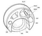 なお、内視鏡ガイド溝326が長手軸300aに対して斜めに形成される場合には、内視鏡ガイド溝326の開口が第1係合部404Aに対向する位置からずれるため、連結リング402の前後方向の移動によって第1係合部404Aが通過する隔壁部材324の範囲は、第1係合部404Aと干渉しないように平坦な面に沿って切り欠かれている。When theendoscope guide groove 326 is formed obliquely with respect to thelongitudinal axis 300a, the opening of theendoscope guide groove 326 is displaced from the position facing thefirst engagement portion 404A. The range of thepartition member 324 through which the first engagingportion 404A passes by the movement in the front-rear direction is cut out along a flat surface so as not to interfere with the first engagingportion 404A.