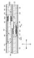 連結リング402は、隔壁部材324により前後方向に進退移動可能に支持され、且つ上下左右方向への移動及び全方向(前後と左右と上下の3軸周り方向)への回転が規制された状態(少なくとも長手軸周りの回転が不能な状態)で隔壁部材324により支持される。また、連結リング402は、後規制端408が基端キャップ部340に当接する位置を後端とし、前規制端410が先端キャップ部360に当接する位置を前端とする移動可能範囲内で進退移動、すなわち本発明の第3範囲で進退移動する。Theconnection ring 402 is supported by thepartition member 324 so as to be movable back and forth in the front-rear direction, and the movement in the up-down and left-right directions and the rotation in all directions (the front-rear, left-right, and up-and-down three-axis directions) are restricted ( At least in the state where rotation around the longitudinal axis is impossible), it is supported by thepartition member 324. Further, the connectingring 402 moves forward and backward within a movable range in which the position where therear regulating end 408 contacts the proximalend cap portion 340 is the rear end and the position where thefront regulating end 410 contacts the distalend cap portion 360 is the front end. That is, it moves forward and backward within the third range of the present invention.