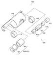 図24はスライダ400の外観斜視図である。図25はスライダ400の分解斜視図である。図24及び図25と、既述の図17及び図18とに示すように、スライダ400は、内視鏡ガイド溝326の内部に配置される内視鏡連結部420と、処置具ガイド溝328の内部に配置される処置具連結部422と、これら内視鏡連結部420及び処置具連結部422を一体的に連動させる連結リング402と、連結リング402に設けられた後規制端408及び前規制端410と、を備える。FIG. 24 is an external perspective view of theslider 400. FIG. 25 is an exploded perspective view of theslider 400. As shown in FIGS. 24 and 25 and FIGS. 17 and 18 described above, theslider 400 includes anendoscope connecting portion 420 disposed inside theendoscope guide groove 326 and a treatmentinstrument guide groove 328. A treatmentinstrument connecting portion 422 disposed inside the endoscope, a connectingring 402 that integrally links theendoscope connecting portion 420 and the treatmentinstrument connecting portion 422, arear regulating end 408 provided on the connectingring 402, and a front side. And arestriction end 410.
