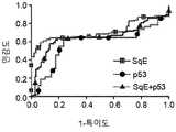 그 결과 SqE의 AUC(Area Under the Curve) 값은 0.7101 (95% CI: 0.6174-0.8029)로 p53의 0.5827 (95% CI: 0.4619-0.7035) 보다 더 높게 나타났다. 또한 2종 단백질의 조합 (SqE+p53) AUC값은 0.6530 (95% CI: 0.5783-0.7276)로 확인되었다. 이는 SqE 단독 또는 SqE 및 p53의 조합, p53 단독에 의해 대장암의 전이 여부를 진단할 수 있음을 의미한다 (도 18).As a result, the area under the curve (AUC) of SqE was 0.7101 (95% CI: 0.6174-0.8029), which was higher than 0.5827 (95% CI: 0.4619-0.7035) of p53. In addition, the combination (SqE + p53) AUC of the two proteins was found to be 0.6530 (95% CI: 0.5783-0.7276). This means that metastasis of colorectal cancer can be diagnosed by SqE alone or a combination of SqE and p53, p53 alone (FIG. 18).