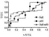 실시예 11의 표 6 데이터 (대장암 환자 중 생존환자 vs 사망환자)로부터 SqE 및 p53의 최적 컷-오프 값 (cut-off value)을 계산하여 SqE 및 p53의 최적 컷-오프 값 (cut-off value)에 기초한 대장암 환자 예후 민감도와 특이도를 조사하였다.The optimal cut-off values of SqE and p53 were calculated from the Table 6 data of Example 11 (survival vs death patients in colorectal cancer patients) to calculate optimal cut-off values of SqE and p53. The prognostic sensitivity and specificity of colorectal cancer patients based on their values) were investigated.