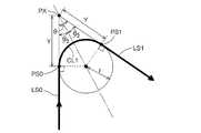 図13の太線は、収穫機1の外側から内側に向かって渦巻き状に走行する走行経路を示している。作業対象領域CAの最外周に位置する走行経路要素L11が最初の走行経路として選択される。走行経路要素L11と走行経路要素L21との交点でほぼ90°の経路変更が行われ、収穫機1は走行経路要素L21を走行する。さらに、走行経路要素L21と走行経路要素L31との交点でほぼ70°の経路変更が行われ、収穫機1は走行経路要素L31を走行する。走行経路要素L31と走行経路要素L41との交点でほぼ110°の経路変更が行われ、収穫機1は走行経路要素L41を走行する。次に、収穫機1は、走行経路要素L11の内側の走行経路要素L12と走行経路要素L41との交点で走行経路要素L12に移行する。このような走行経路要素の選択を繰り返すことで、収穫機1は、圃場の作業対象領域CAを外から内への渦巻き状に作業走行する。このように、渦巻き走行パターンが設定されている場合、未走行の属性を有するとともに作業対象領域CAの最外周に位置する走行経路要素同士の交点で経路変更が行われ、収穫機1は方向転換をする。The thick line in FIG. 13 indicates a travel route that travels spirally from the outside to the inside of the
