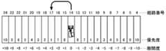 次に走行すべき走行経路要素の選択は、経路要素選択部63によって行われるが、この実施形態では、基本的な選択の優先度として、順番元になる走行経路要素から所定距離だけ離れている適正離間走行経路要素を最高優先度とし、この適正離間走行経路要素に比べて順番元になる走行経路要素から離れるほど、優先度は低くなるように設定される。例えば、次の走行経路要素への移行に関しては、走行距離の短いノーマルUターン走行が走行時間も短く、効率が良い。したがって、2本あけた左右両隣りの走行経路要素の優先度が最も高く設定される(優先度=「1」)。それより収穫機1から離れるほど、ノーマルUターン走行の走行時間が長くなるので、優先度が低くなる(優先度=「2」,「3」,・・・)。つまり、優先度の数値は優先順位を示している。ただし、ノーマルUターン走行の走行時間が長くなり、スイッチバックターン走行より効率が悪くなる8本あけた隣りの走行経路要素への移行の優先度は、スイッチバックターン走行より低くなる。スイッチバックターン走行では、隣の走行経路要素へ移行する優先度より、1本あけた走行経路要素へ移行する優先度の方が高くなっている。これは隣の走行経路要素へのスイッチバックターン走行は、急旋回が必要となり、圃場を荒らす可能性が高いからである。なお、次の走行経路要素への移行は、左右いずれの方向も可能であるが、従来の作業の慣習にしたがって、左側の走行経路要素への移行が右側の走行経路要素への移行に優先するというルールが採用される。したがって、図10の例では、経路番号:14に位置する収穫機1は、次に走行する走行経路要素として、経路番号:17の走行経路要素を選択する。このような優先度の設定が、収穫機1が新しい走行経路要素に入るごとに行われる。The route element to be traveled next is selected by the route