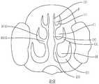 参阅图1、2,为人体鼻腔内的矢状剖面与冠状剖面视图,与鼻子的外观相似,鼻腔正面呈现上窄下宽的三角形,鼻腔由鼻中膈分隔成左右两个空间。在每一个空间中,介于宽阔的前方鼻前庭90及后方鼻咽91之间的鼻腔本体是由三片弯曲的板状结构隔成三个稍微弯曲的隙缝状通路,及一个临中膈空间。此三片由上向下渐大的板状结构称为上鼻甲A、中鼻甲B,及下鼻甲C,而三个由上向下渐大的通路则为上鼻通道A1、中鼻通道B1及下鼻通道C1。中鼻通道常分为约2cm的下降段(B1D)及约1cm的水平段(B1H)两段。临中膈空间以上、中、下鼻甲A、B、C下缘区分为上、中、下临中膈空间D1、D2、D3。鼻腔本体前后径约5cm,中鼻甲B、及下鼻甲C、中鼻通道B1及下鼻通道C1均5cm;而上鼻甲A及上鼻通道A1只占鼻腔本体后半部,前后径约2.5cm。三个鼻甲,鼻中膈及鼻腔侧壁均由骨胳构成骨架,表面再覆被粘膜,以此增加表面积使鼻腔本体的空间成为隙缝状通路并具有两个功能:1.调整吸入空气的湿度及温度。2.过滤空气中颗粒状物质,预防其掉入气管及肺脏(参阅nasal cavity,wikipedia)。此三个鼻通道除向内与临中膈空间,向前与鼻前庭90及向后与鼻咽相通外,为彼此独立的空间。所有粘液都由鼻腔旁边及上面的四对鼻窦(上颌窦、前额窦、筛状窦、蝶状窦)分泌,并从位于上鼻通道A1(筛状窦后三分之一)、中鼻通道B1(上颌窦、前额窦及筛状窦前三分之二)及鼻咽顶部(蝶状窦)的几个圆形细小开口(通常1mm或更小)排出。慢性鼻窦炎病人求诊时多已有严重鼻塞的症状,而且无法回复正常状态,因此难以回忆其发生的过程,但其致病机转(pathophysiology)可由感冒的过程来说明。Referring to Figures 1 and 2, the sagittal section and the coronal section of the human nasal cavity are similar to the appearance of the nose. The front of the nasal cavity presents a narrow, wide triangle, and the nasal cavity is divided into two left and right spaces by the nasal septum. In each space, the nasal body between the wide front