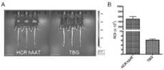 1実施形態において、本発明のrAAVベクターは、好ましくは、肝臓細胞特異的なプロモーター配列およびそのプロモーター配列と作動可能に連結されたゲノム編集手段及び/又は修復用遺伝子を含むポリヌクレオチドを含む(すなわち、そのようなポリヌクレオチドがパッケージングされている)。本発明に用いるプロモーター配列としては、肝臓に含まれる細胞に特異的なプロモーター配列、例えば、肝実質細胞、肝非実質細胞(星状細胞等)などに特異的なプロモーター配列を用いることができる。このようなプロモーター配列としては、具体的には、ApoEプロモーター、アンチトリプシンプロモーター、cKitプロモーター、肝臓特異的転写因子(HNF-1、HNF-2、HNF-3、HNF-6、C/ERP、DBPなど)のプロモーター、サイロキシン結合グロブリン(TBG)プロモーター(Nature. 2015 Apr 9;520(7546):186-91)(配列番号34)、ヒトSEPP1プロモーター領域(肝臓特異的プロモーター)(配列番号35)、その他の肝臓特異的タンパク質(アルブミンなど)のプロモーター、これらプロモーターを組み合わせた合成プロモーターなどが挙げられるが、これらに限定されない。また、これらのプロモーターはさらに、公知のエンハンサー配列、好ましくは肝臓細胞特異的なエンハンサー配列と組み合わせることができる。本発明において使用できるエンハンサー配列としては、ApoEエンハンサー配列、ヒトTIE2エンハンサー(内皮細胞特異的エンハンサー)(配列番号36)などが挙げられる。これらプロモーター配列およびエンハンサー配列は、単独または任意の複数を組み合わせて用いることができる。さらにまた、上記の肝臓細胞特異的なプロモーター及びエンハンサーを利用した合成プロモーターを用いることもできる。このような合成プロモーター/エンハンサー配列としては、HCRhAAT合成プロモーター(配列番号1)が挙げられるがこれに限定されない。本発明のrAAVベクターは、好ましくは、肝臓特異的、より好ましくは肝実質細胞特異的なApoEプロモーター、アンチトリプシンプロモーター、TBGプロモーター、またはHCRhAAT合成プロモーターの配列を含み得る。(2) Promoter sequence used in the present invention In one embodiment, the rAAV vector of the present invention is preferably a liver cell-specific promoter sequence and genome editing means and / or repair operably linked to the promoter sequence. A polynucleotide comprising a gene for use (ie, such a polynucleotide is packaged). As a promoter sequence used in the present invention, a promoter sequence specific to cells contained in the liver, for example, a promoter sequence specific to liver parenchymal cells, liver non-parenchymal cells (eg, astrocytes), and the like can be used. Specific examples of such promoter sequences include ApoE promoter, antitrypsin promoter, cKit promoter, liver-specific transcription factor (HNF-1, HNF-2, HNF-3, HNF-6, C / ERP, DBP Etc.), thyroxine binding globulin (TBG) promoter (Nature. 2015 Apr 9; 520 (7546): 186-91) (SEQ ID NO: 34), human SEPP1 promoter region (liver specific promoter) (SEQ ID NO: 35), Examples include, but are not limited to, promoters of other liver-specific proteins (such as albumin) and synthetic promoters combining these promoters. These promoters can be further combined with known enhancer sequences, preferably liver cell-specific enhancer sequences. Enhancer sequences that can be used in the present invention include ApoE enhancer sequences, human TIE2 enhancer (endothelial cell specific enhancer) (SEQ ID NO: 36) and the like. These promoter sequences and enhancer sequences can be used alone or in combination of any plurality. Furthermore, a synthetic promoter using the above liver cell-specific promoter and enhancer can also be used. Such synthetic promoter / enhancer sequences include, but are not limited to, the HCRhAAT synthetic promoter (SEQ ID NO: 1). The rAAV vector of the present invention may preferably comprise a liver-specific, more preferably hepatocyte-specific ApoE promoter, antitrypsin promoter, TBG promoter, or HCRhAAT synthetic promoter sequence.