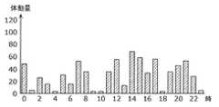 図3A及び図3Bのように、健常者では、昼の活動と夜の睡眠とで体動量が明確に異なる。そして、異なる2つの日において、各時間帯の体動量の変動が小さく、生活パターンが安定している。一方、図4A及び図4Bのように、認知症者では、昼の活動が少なく、夜に覚醒によって体動が発生している。そして、異なる2つの日において、各時間帯の体動量の変動が大きく、生活パターンが安定していない。As shown in FIG. 3A and FIG. 3B, the amount of body movement is clearly different between a daytime activity and a nighttime sleep in a healthy person. And in two different days, the fluctuation | variation of the amount of body movement of each time slot | zone is small, and the life pattern is stable. On the other hand, as shown in FIG. 4A and FIG. 4B, dementia has little activity during the day, and body movement occurs due to awakening at night. And in two different days, the fluctuation | variation of the amount of body movement of each time slot | zone is large, and a life pattern is not stable.