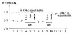図11のように、健常者では、各時間帯の体動量が複数の日の間で大きく異ならない。従って、複数の時間帯のそれぞれにおいて、1ヵ月間における体動量の標準偏差は、1ヵ月間における体動量の平均値に対して小さい。即ち、複数の時間帯のそれぞれにおいて、1ヵ月間における体動量の変動係数は小さい。As shown in FIG. 11, in a healthy person, the amount of body movement in each time zone does not vary greatly between multiple days. Therefore, in each of the plurality of time zones, the standard deviation of the body movement amount during one month is smaller than the average value of the body movement amount during one month. That is, in each of the plurality of time zones, the coefficient of variation in body movement during one month is small.