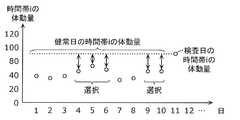 図9は、各時間帯の体動量に基づく異変頻度を示す模式図である。判定部140は、複数の検査日のそれぞれについて、体動量が基準範囲に含まれない時間帯の数が閾値よりも大きい場合に検査日を異変日と判定する。この閾値は、総時間帯数に対する割合で定められてもよい。例えば、閾値は、総時間帯数の半分であってもよい。各時間帯の長さが1時間である場合、総時間帯数は24である。閾値は、その半分の12であってもよい。FIG. 9 is a schematic diagram showing the abnormal frequency based on the amount of body movement in each time zone. For each of the plurality of examination days, the