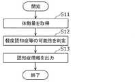 また、本発明の一態様に係る制御プログラムは、マイクロプロセッサを備える装置に、認知症情報出力処理を実行させるための制御プログラムであって、前記認知症情報出力処理は、ユーザの体動量を取得する取得ステップと、前記体動量が複数の時間帯のそれぞれにおいて複数の日の間で変動している度合いである変動度に基づいて、前記ユーザが軽度認知症等を発症している可能性を判定する判定ステップと、前記判定ステップで判定された前記可能性を示す認知症情報を出力する出力ステップとを含む。A control program according to an aspect of the present invention is a control program for causing a device including a microprocessor to execute a dementia information output process, and the dementia information output process acquires a body movement amount of a user. And the possibility that the user has developed mild dementia or the like based on the obtaining step and the degree of fluctuation that is the degree that the body movement amount fluctuates between a plurality of days in each of a plurality of time zones. A determination step of determining, and an output step of outputting dementia information indicating the possibility determined in the determination step.