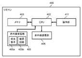 図6は、リモコン400の電気的構成を示すブロック図である。リモコン400は、CPU402と、メモリ403と、赤外線受信部405と、赤外線送信部406と、操作部411とを備える。FIG. 6 is a block diagram showing an electrical configuration of the