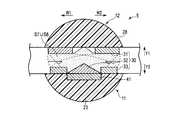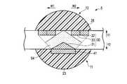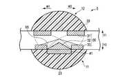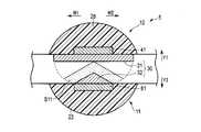 図2は、エンドエフェクタ5を長手軸Cに沿う方向に対して略垂直な断面で示す図である。ここで、長手軸Cに沿う方向に交差し(略垂直で)、かつ、開動作及び閉動作のそれぞれにおけるエンドエフェクタ5の動作方向に交差する(略垂直な)方向として、エンドエフェクタ5の幅方向(矢印W1及び矢印W2で示す方向)を規定する。図2に示すように、把持片11は、把持片12に対向する把持面21と、把持面21とは反対側を向く背面22と、を備える。また、把持片12は、把持片11(把持面21)に対向する把持面25と、把持面25とは反対側を向く背面26と、を備える。FIG. 2 is a view showing theend effector 5 in a cross section substantially perpendicular to the direction along the longitudinal axis C. Here, the width of theend effector 5 is defined as a direction that intersects the direction along the longitudinal axis C (substantially perpendicular) and intersects the operation direction of theend effector 5 in each of the opening operation and the closing operation (substantially perpendicular). A direction (direction indicated by an arrow W1 and an arrow W2) is defined. As shown in FIG. 2, the grippingpiece 11 includes agripping surface 21 that faces the grippingpiece 12 and aback surface 22 that faces away from the grippingsurface 21. In addition, the grippingpiece 12 includes agripping surface 25 that faces the gripping piece 11 (the gripping surface 21) and aback surface 26 that faces away from the grippingsurface 25.