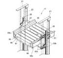 下部側ステーションについても同様であり、昇降載置台が下部側ステーションを離れると下部側横方向載置台が当該昇降載置台があった位置に移動し、下部側ステーションの他の位置に空きスペースができるから、他の昇降載置台をその空きスペースに入れることができる。In the lifting and lowering apparatus of this aspect, a plurality of lifting and lowering mounting tables are provided. Therefore, when one of the elevating mounts is at the upper station, the other elevating mount can be held at the lower station. Similarly, when one lifting platform is at the lower station, the other lifting platform can be clamped at the upper station. Therefore, for example, while the conveyed product on the upper side station is being discharged from the elevating device, the conveyed matter can be carried into the mounting table of the lower side station.