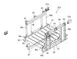 次に上部側横方向載置台5について説明する。上部側横方向載置台5は、図3に示す様に移動台40と、コンベヤ部41と、つり下げコロ43と、走行モータ45を有している。移動台40は、上部側横方向載置台5のフレームを構成する部材であり、鋼材によって四角形に枠組された部材である。即ち移動台40は、水平に配された側面部材44a,44bと、これを接続する接続部材(図示せず)を有し、四角形に枠組みされている。