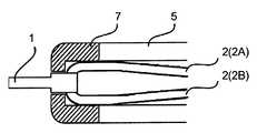 図6~図13には、表面処理部分7が設けられたシース5の様々な構成例が示されている。図6には、シース5の内径が長軸方向に対して一定に形成され、先端チップ1の一部がシース5から突出した状態で、第1ワイヤ部2Aと第2ワイヤ部2Bが表面処理部分7と接する態様が示されている。図7には、シース5の内径が長軸方向に対して一定に形成され、先端チップ1の一部がシース5から突出した状態で、先端チップ1が表面処理部分7と接する態様が示されている。図8には、シース5の内径が長軸方向に対して一定に形成され、先端チップ1の一部がシース5から突出した状態で、導電性接続具3が表面処理部分7と接する態様が示されている。図9、図12および図13には、シース5に小径部が設けられ、先端チップ1の一部がシース5から突出した状態で、第1ワイヤ部2Aと第2ワイヤ部2Bが小径部の表面処理部分7と接する態様が示されている。図10には、シース5に小径部が設けられ、先端チップ1の一部がシース5から突出した状態で、先端チップ1が小径部の表面処理部分7と接する態様が示されている。図11には、シース5に小径部が設けられ、先端チップ1の一部がシース5から突出した状態で、導電性接続具3が表面処理部分7と接する態様が示されている。6 to 13 show various configuration examples of the