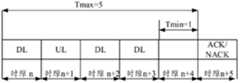 参阅图2,图2提供一种第五代移动通信技术5G新空口NR的网络结构示意图,如图2所示,在新空口基站(英文:New Radio Node B,NR-NB)下,可能存在一个或多个发送接收点(英文:Transmission Reception Point,TRP),一个或多个TRP范围内可以存在一个或多个终端。在如图2所示的NR系统中,终端需要对下行数据通过HARQ向基站反馈该下行数据是否接收成功,即终端需要向基站反馈HARQ ACK/NACK。由于在NR系统中,针对数据(主要是下行数据)的ACK/NACK反馈信息的HARQ timing可以由gNB动态指示,下面的传输时间单元以slot为例,参阅图2A,为一种NR系统的HARQ timing的传输时间单元的示意图,这里假设在slot n中指示该HARQ timing,如图2A所示,这里假设该HARQ timing可以为5个时隙,在5个时隙中,slot n为下行链路(Downlink,DL)传输的下行数据,slot n+1为上行链路(Uplink,UL)传输的上行数据,slot n+2为下行数据,slot n+3为 下行数据,slot n+4为空,slot n+5为终端向基站反馈该ACK/NACK的时隙,由于该slot n+2、slot n+3均为下行数据,那么对于slot n+2、slot n+3也需要反馈其对应的ACK/NACK,如gNB动态指示该slot n+2对应的ACK/NACK的HARQ timing为3个时隙,该slot n+3对应的ACK/NACK的HARQ timing为2个时隙,那么对于slot n+5即具有3个slot的ACK/NACK,即在slot n+5内,3个slot的ACK/NACK需要复用传输,如图2所示的NR系统中的终端无法实现3个slot的ACK/NACK在slot n+5内的复用传输。Referring to FIG. 2, FIG. 2 provides a network structure diagram of a 5G new air interface NR of the fifth generation mobile communication technology. As shown in FIG. 2, under the new air interface base station (English: New Radio Node B, NR-NB), there may be One or more Transmission Reception Points (TRPs), one or more terminals may exist within one or more TRP ranges. In the NR system shown in FIG. 2, the terminal needs to feed back the downlink data through the HARQ to the base station, whether the downlink data is successfully received, that is, the terminal needs to feed back the HARQ ACK/NACK to the base station. Since in the NR system, HARQ timing of ACK/NACK feedback information for data (mainly downlink data) can be dynamically indicated by gNB, the following transmission time unit is exemplified by slot, see FIG. 2A, which is an HARQ of an NR system. Schematic diagram of the transmission time unit of timing, assuming that the HARQ timing is indicated in slot n, as shown in FIG. 2A, it is assumed here that the HARQ timing can be 5 slots, and in 5 slots, slot n is downlink. (Downlink, DL) downlink data transmitted, slot n+1 is uplink data transmitted by uplink (UL), slot n+2 is downlink data, slot n+3 is downlink data, and slot n+4 is empty. Slot n+5 is the time slot for the terminal to feed back the ACK/NACK to the base station. Since the slot n+2 and slot n+3 are downlink data, the corresponding need for feedback for slot n+2 and slot n+3. ACK/NACK, such as gNB dynamically indicates that the HARQ timing of the ACK/NACK corresponding to the slot n+2 is 3 slots, and the HARQ timing of the ACK/NACK corresponding to the slot n+3 is 2 slots, then for the slot n+5 is an ACK/NACK with 3 slots, that is, in slot n+5, ACK/NACK of 3 slots needs to be multiplexed. , ACK NR terminal system shown in FIG. 3 not possible slot / NACK for multiplex transmission in slot n + 5 in.