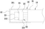 一外罩30,其为透明的光学材质所制成,其概呈一端封闭的管体,该使该外罩30沿轴线的一端形成一开口部31,另一端则一体形成有一前挡部32,其中,该开口部31固设于该电缆线10上,使该取像装置20位于该外罩30内,另该前挡部32为一平直段,该前挡部32垂直于该外罩30的轴线,且恰位于该镜头23的前方,以供保护该镜头23,又,于本实施例中,该外罩30的内壁301对应该等自体发光件25分别设有一弧形凹槽302。An