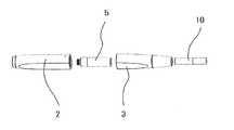 図4を参照して、カトマイザ内のリキッドとフレーバーAは、アトマイザで180℃から300℃以下程度に加熱されて霧化される。ユーザが、キャップの先端の吸い口より吸引することにより、アトマイザ内に設けてあるスイッチにより加熱処理が起動、リキッドの沸点に達し霧化しフレーバーAとリキッドを原料とする霧は、さらにフレーバーBを含んで噴出し、ユーザの体内に入る。Referring to FIG. 4, the liquid and flavor A in the toomizer are atomized by being heated to about 180 ° C. to 300 ° C. or less by the atomizer. When the user aspirates from the tip of the cap tip, the switch provided in the atomizer activates the heat treatment, reaches the boiling point of the liquid, atomizes it, and the mist made from the flavor A and the liquid further adds the flavor B It spouts and enters the user's body.