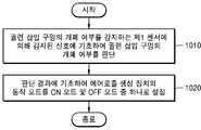 또한, 다른 측면에 따른 에어로졸 생성 장치를 제어하는 방법은, 상기 에어로졸 생성 장치에 포함된 센서에 의해 감지된 신호에 기초하여 궐련 삽입 구멍의 개폐 여부를 판단하는 단계; 및 상기 판단 결과에 기초하여 상기 에어로졸 생성 장치의 동작 모드를 ON 모드 또는 OFF 모드로 설정하는 단계를 포함할 수 있다.According to another aspect of the present invention, there is provided a method of controlling an aerosol generating apparatus, comprising: determining whether a cigarette insertion hole is opened or closed based on a signal detected by a sensor included in the aerosol generating apparatus; And setting an operation mode of the aerosol generating apparatus to an ON mode or an OFF mode based on the determination result.