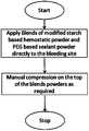 In yet another embodiment, the PEG based sealant powder (s) may be mixed with the modified starch based powder for application. The method of use for this embodiment is  illustrated in the flowchart of FIG. 8. Referring to FIG. 8, in step 801 a layer of a powder comprising a blend of modified starch based biocompatible hemostatic powder and PEG based sealant powder (s) of the present specification, is applied directly to the bleeding site. Optionally in step 802, manual compression may be applied over the blend powders, as required by the situation. Steps 801 and 802 may be repeated until complete hemostasis is achieved.